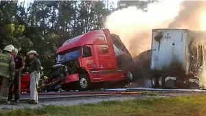 Fiery collision on the interstate. Tractor-trailer transport truck barrels into another stopped in stalled traffic on the interstate.